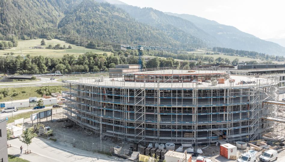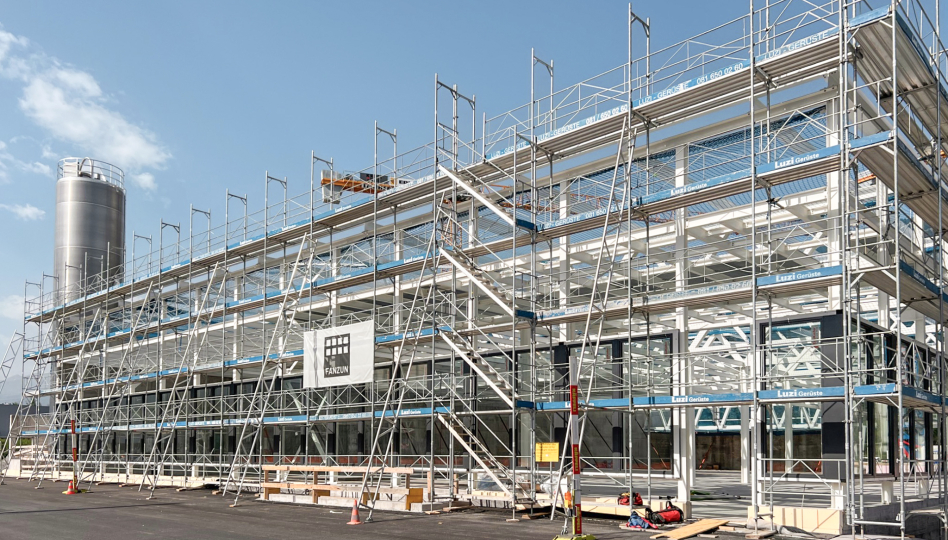 Standardisierte Maler- und Maurergerüste zum Sicherheitsschutz während der Rohbauphase und als Hilfskonstruktion zur Gestaltung der Aussenhülle. Hier können auch spezielle Formen und Höhen mit einfachen Hilfsmitteln sicherheitskonform realisiert werden.